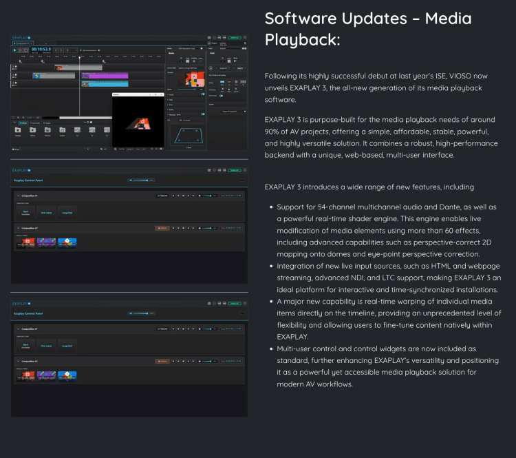 Exaplay 3, an easy to use, universal multi-media playback system, SW or Complete system, with or without auto calibration. Multi-channel, multi-screen, Exaplay fills the gap between high end, high price media servers, like Dataton, Pixera, disguise, etc. and simple devices like the Wave Systems VP/ EVP players. Since Exaplay 3 can be purchased in software only or complete assembled Anystation servers, it is hightly flexible, can be very costeffective and reduce shipping and import cost, where complete systems are difficult and expensive to get into the country.